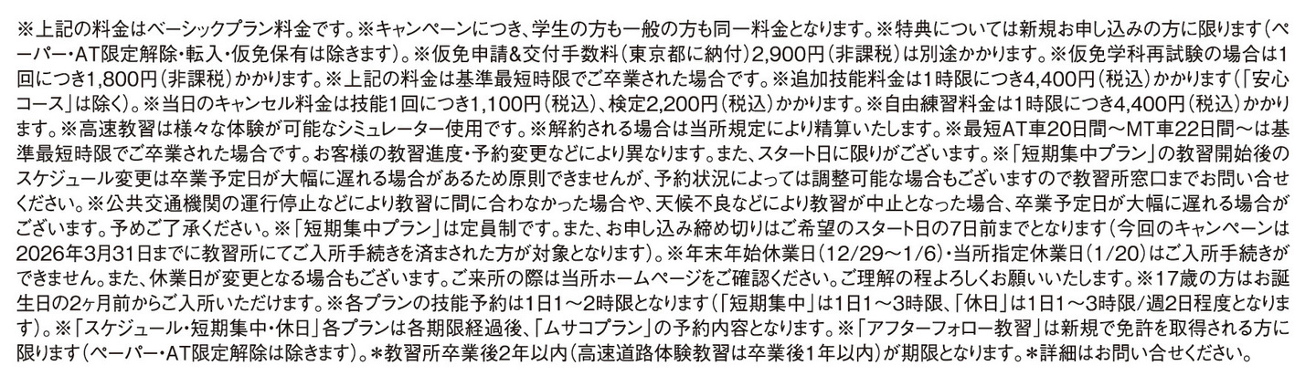 ※短期集中プランは、教習の延長、試験の不合格、スケジュール変更、などその他突発的な理由により、最短日数での卒業とならない場合もございます。