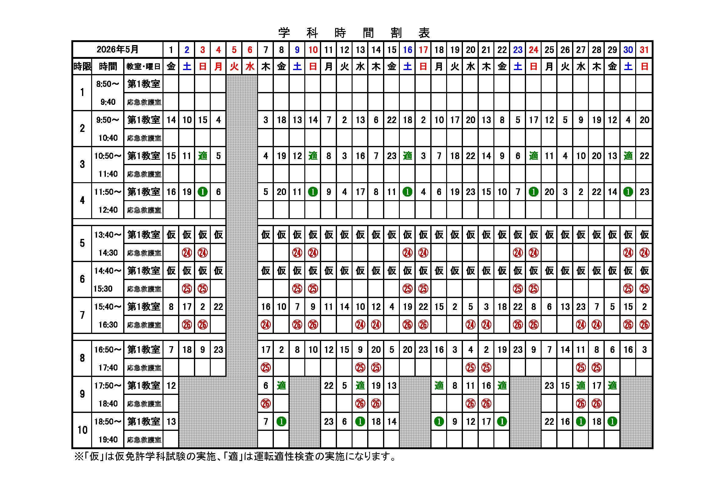 2026年5月分学科時間割