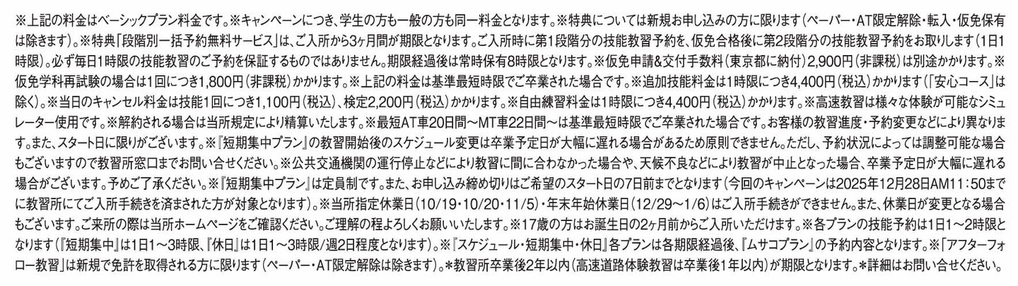 ※短期集中プランは、教習の延長、試験の不合格、スケジュール変更、などその他突発的な理由により、最短日数での卒業とならない場合もございます。