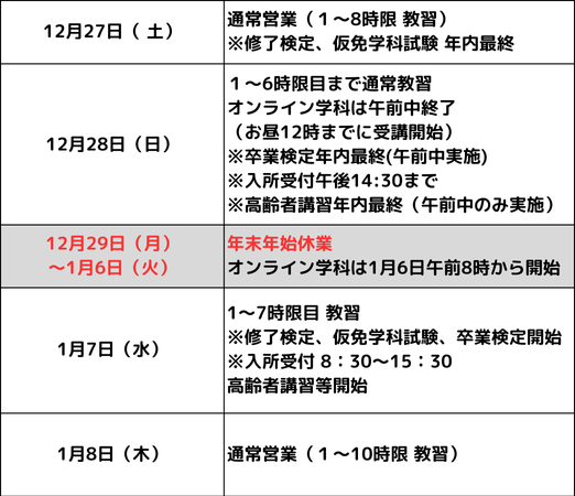 12/5(金)は設備点検のため休業日となります。 《オンライン学科教習の受講は可能です》 ご迷惑をおかけいたしますが、ご理解の程よろしくお願い申し上げます。 |
